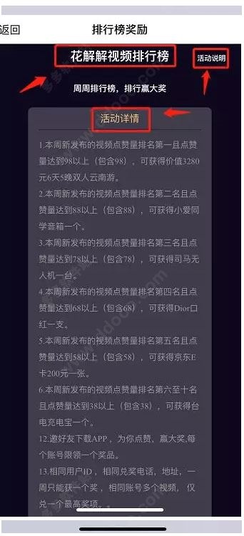 在花解解,拍视频和看视频都能获得红包。每周上传新视频,还能参加排行榜活动,领取奖品。